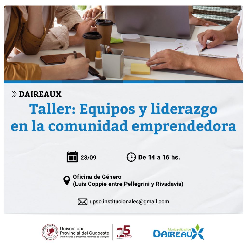 La Universidad Provincial del Sudoeste y la Secretaría de Desarrollo Económico, Ambiente y Empleo de la Municipalidad de Daireaux invitan a toda la comunidad de Daireaux al Taller: «Equipos y liderazgo en la comunidad emprendedora».