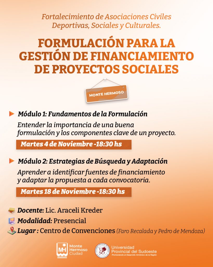 La Universidad Provincial del Sudoeste (UPSO) junto al Municipio de Monte Hermoso invitan a participar del módulo “Formulación para la gestión de financiamiento de proyectos sociales”, perteneciente al Programa de Formación Continua: Fortalecimiento de Asociaciones Civiles Deportivas, Sociales y Culturales.